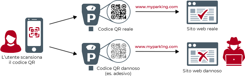 Nell'esempio sopra, un attaccante ha effettuato un attacco di quishing incollando un codice QR dannoso su un parchimetro, che porta l'utente a una copia falsa del sito originale usando un URL simile.
